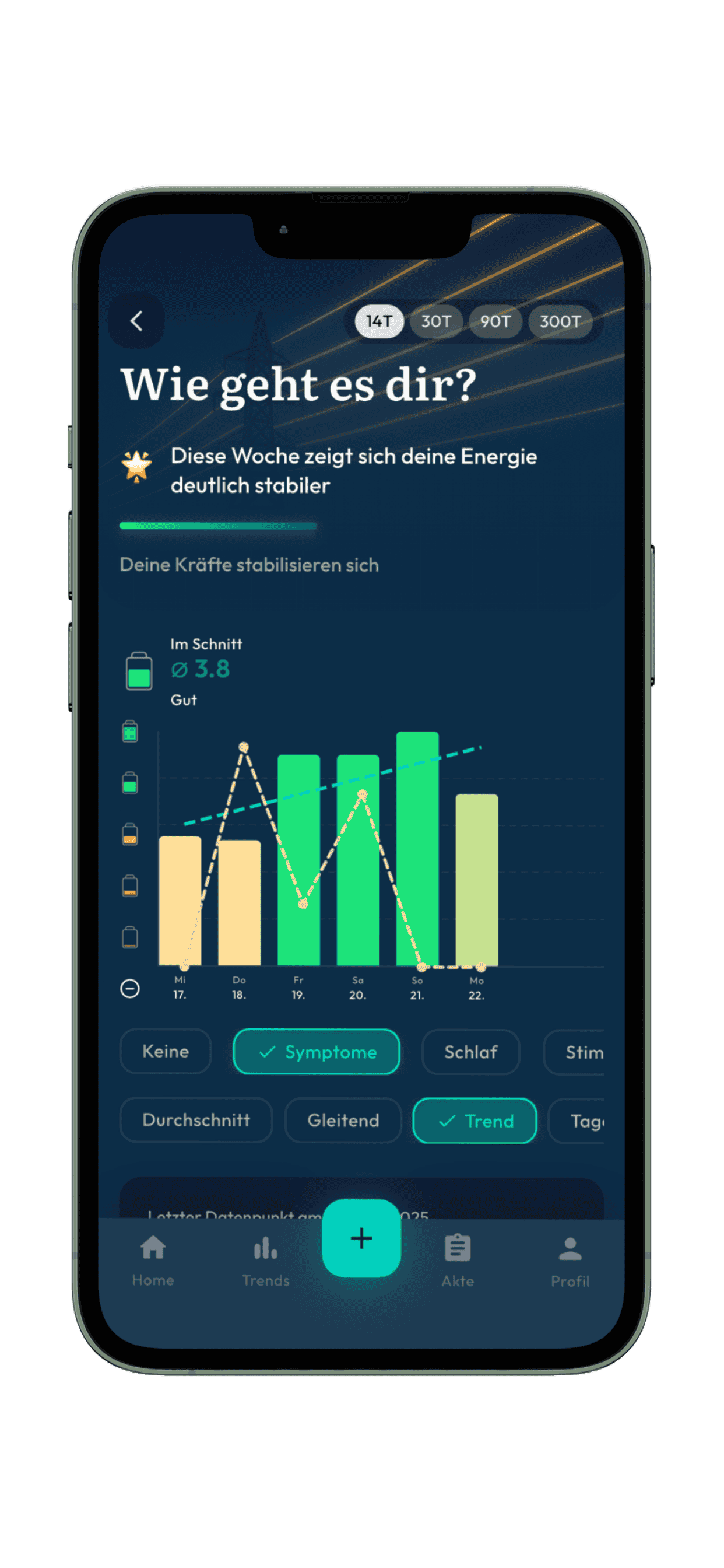 Behalte deine wichtigsten Körperdaten im Blick – einfach und übersichtlich. Erkenne persönliche Muster im Zusammenspiel von Wohlbefinden, Symptomen und Aktivitäten – für mehr Selbstwahrnehmung und bewusstere Entscheidungen im Umgang mit deiner Energie.